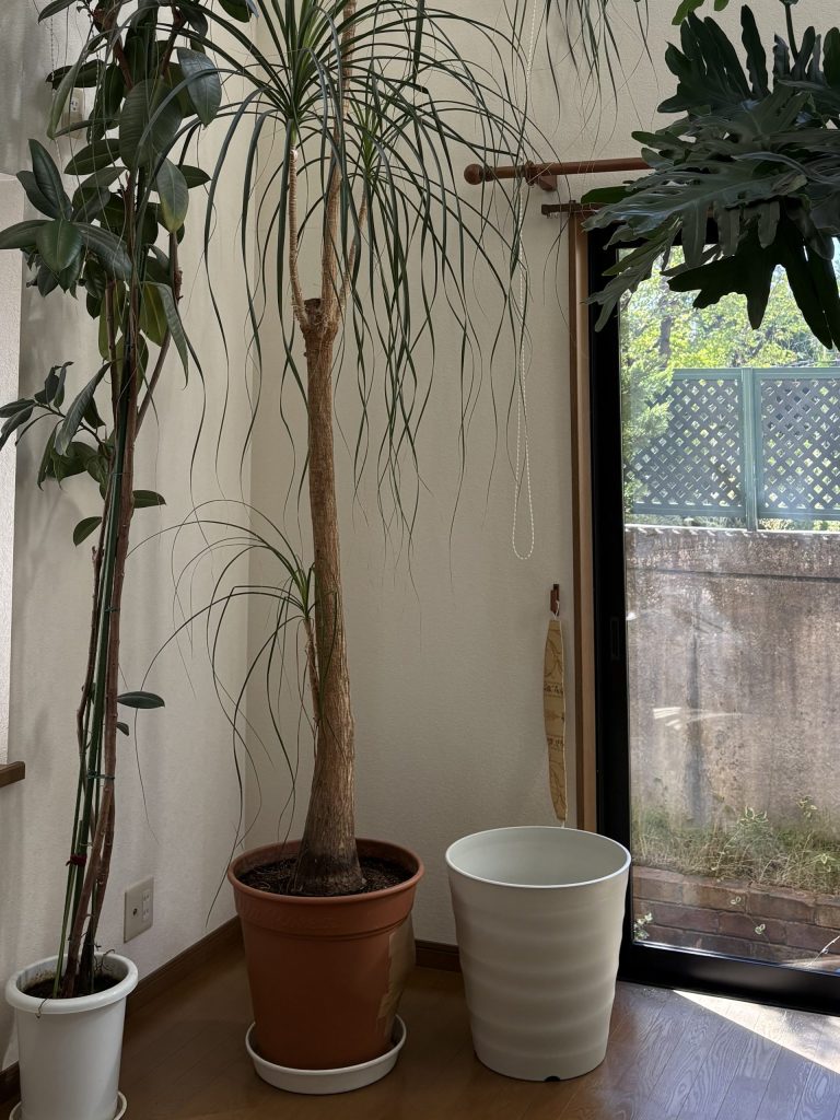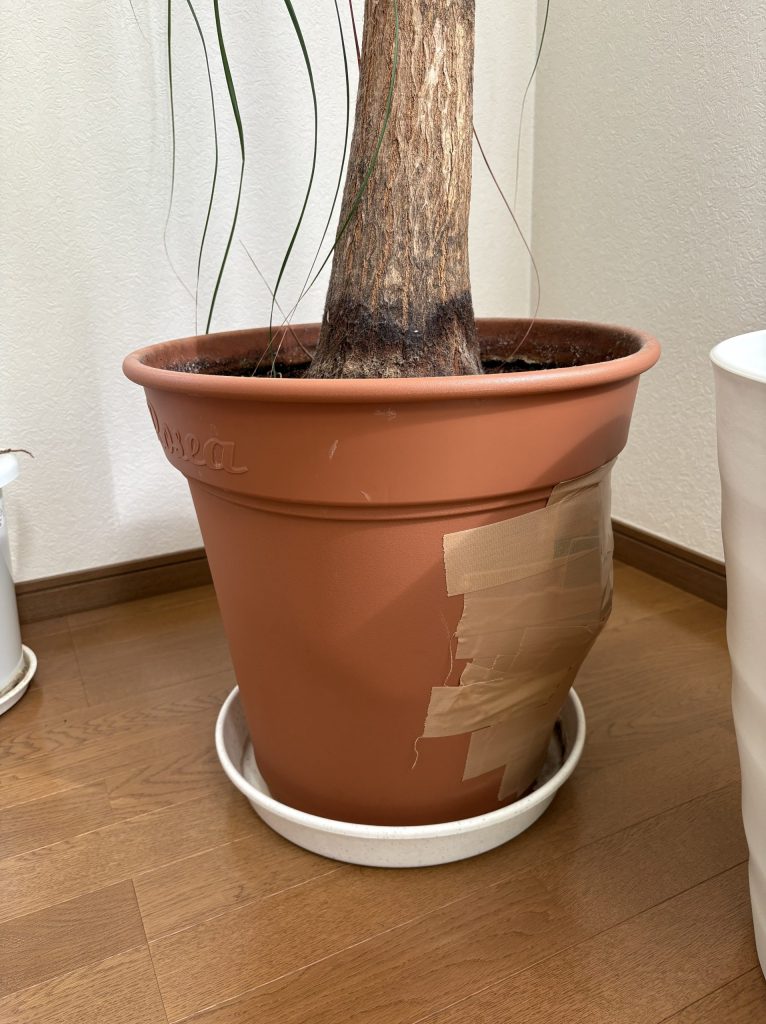 ずっと先延ばしにしていたリビングの観葉植物の鉢替え。さすがに暑い夏が終わったらどこかに頼まないと破裂する💥😱💥ガムテープの補強は右側と後ろの2箇所、更に正面も膨らんできた😰😰😰